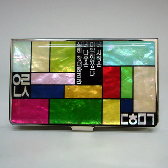 這個獨特的珍珠母名片盒,不僅簡單的重現了chogakbo的設計,更融入了現代藝術家的思考。Chogakbo是家庭主婦製作衣服時候剩下的布料。她們把這些布料拼湊在一起製作出新的圖案,多用於裝飾。藝術家們把這種思路與珍珠母鑲嵌技術相融合,創造了這件藝術品。在在盒子的背面,有格子狀的設計,起到防滑的作用。
