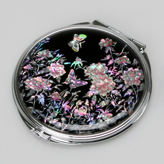 這個時尚的化妝鏡裡面包括兩個鏡子,一個普通鏡,一個放大鏡。無論是盛開的牡丹花,還是其中的蝴蝶,都體現了韓國工藝品中獨有的田園詩般的景觀。在韓國文化中,盛放的牡丹是財富和貴族的象徵。精心製作的珍珠母和純黑色的背景,令人過目難忘。在背面,採用了阿拉伯式的格子狀設計,起到防滑的作用。
