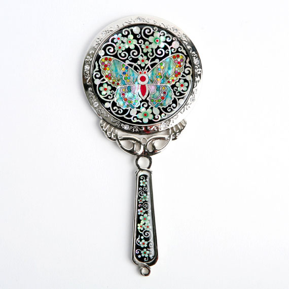 這個時髦的手持化妝鏡採用優雅的蝴蝶設計。蝴蝶,在韓國文化中象徵著愛情和幸福,常常被都市女性用來裝飾時尚物品或家居用品。藝術家們重新設計,把傳統的珍珠母鑲嵌技術和蝴蝶融合在一起,色彩亮麗,令人過目難忘。