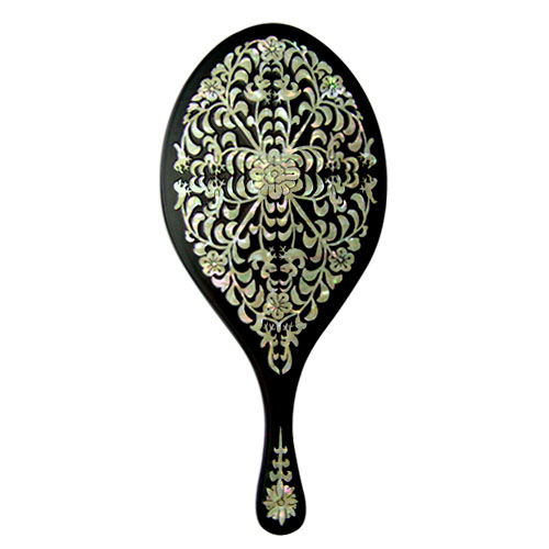 全手工製作,圖案由貝母製成,手持部位為木製。形象的花鳥圖案象徵著平和與美好。